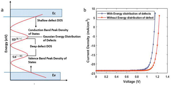 (a) Density of state (DOS) of the semiconductor material; (b) current density–voltage characteristics for the solar cell with and without adoption of energy distribution of defects.