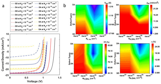 (a) Current–voltage characteristics of a solar cell on inclusion of metastable defect states with varying trap densities (b) Influence of metastable defect states, single donor (SD), single acceptor (SA), double donor (DD), and double acceptor (DA), at varying defect densities, on open-circuit voltage, short-circuit current density, fill factor and efficiency of the solar cell.