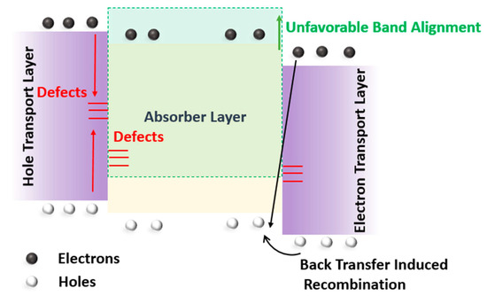 Interfacial recombination plays a significant role in determining the performance of the solar cell. Interface defects emerge due to recombination centers at the interface of the absorber material/hole-transport layer (or electron-transport layer) [38]. These recombination centers can be present inside the absorber layer or hole-transport layer (or electron-transport layer), at the interface. Other reasons for interface defects can be an unfavorable HTL/absorber layer (or absorber layer/ETL), band alignment, and back-transfer-induced recombination [39], as illustrated in Figure 9.