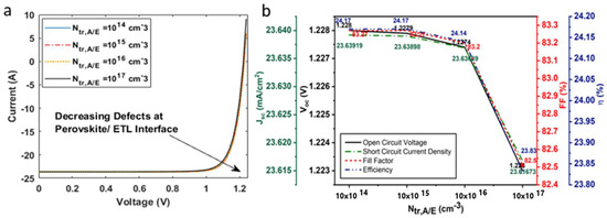 (a) Current voltage characteristics of solar on inclusion of interface defects at hole transport layer/absorber layer; (b) influence of interface defects on open-circuit voltage, short-circuit current density, fill factor, and efficiency of the solar cell.