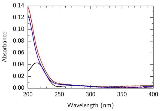 Optical absorption spectra of pristine PMMA/quartz (black line), DUV-exposed PMMA/quartz irradiated in air (red line), DUV-exposed PMMA irradiated in argon (blue line). PMMA film thickness, 0.25 µm.