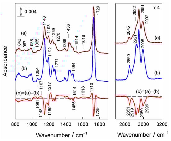 To gain insight into the molecular changes of DUV exposure induced in PMMA film, we performed an analysis of FTIR transmission spectra (Figure 2). The dominant absorption bands are associated with the C−H stretching of CH3 and CH2 groups (2845, 2922, 2951, and 2992 cm−1), C=O stretching (1729 cm−1), and stretching vibration of the C−O−C group (1148 and 1193 cm−1). The vibrational spectrum of PMMA has been analyzed in detail in previous publications [,,,,,,]. The difference spectrum reveals the appearance of radiation-induced new absorption bands (positive-going features) and decrease in relative intensity of PMMA bands due to cleavage of some chemical bonds (negative-going features). In the fingerprint spectral region (800–1450 cm–1), the relative intensity of the 1148 cm−1 band associated with the symmetric stretching vibration of the C−O−C group decreases the most, indicating DUV-radiation-induced cleavage of ester bonds. The negative-going feature at 1729 cm–1 due to the C=O stretching vibration of the ester group confirms this scenario. In the C−H stretching vibration spectral region, one can find direct evidence of radiation-induced destruction of CH2 groups, as two intense negative-going bands at 2851 and 2919 cm−1, associated with symmetric and asymmetric stretching vibrations of the methylene group, respectively, appear in the difference spectrum. In addition, the negative-going band, due to CH2 scissoring deformation vibration, is visible near 1486 cm–1. These spectral changes indicate cleavage in the vicinity of the –CH2−moiety (main chain). The positive-going feature near 1710 cm−1 reveals the DUV-exposure-induced formation of new species, most likely containing C=O of aldehyde and/or ketone functional groups. The positive-going broad feature near 1618 cm−1 is consistent with the formation of sp2-hybridized carbon bonds, aromatic carboxyl groups, and hydroxyl groups []. In addition, positive-going features near 1107 and 1217 cm−1 support the formation of compounds containing C−O bonds or/and hydroxyl groups. Earlier works investigating similar FTIR spectra of DUV-exposed PMMA also concluded that bands of newly produced species were observed in the IR spectrum, and were attributed to ketone-type and aldehyde-type compounds [].