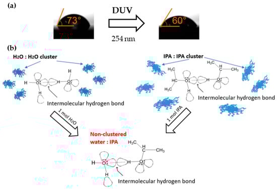 (a) Water contact angle on PMMA before (left) and after (right) DUV exposure. Increased hydrophilicity observation corresponds to increasing polarity of new chemical products received after DUV exposure of PMMA. (b) Schematic representation of reconstruction of water: water and IPA: IPA clusters into non-clustered water: IPA mixture to act as an effective solvent, where under specific water: IPA mixture due to formation of hydrogen bonds connect effectively to the polymer.