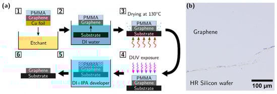 CVD graphene was transferred onto HR Si substrates using a standard wet transfer procedure using PMMA as a support layer [,]. The approach is shown schematically in steps 1–3 in Figure 4a, and with the final steps 4 and 5 referred to later in the text as the proposed “DUV method”. First, a Cu foil is etched away in a dilute room temperature RCA standard cleaning 2 (SC-2) solution of 60:5:2 H2O/HCl/H2O2, adapted from []. Then, the translucent PMMA/graphene stack is rinsed thoroughly in DI water and wet transferred to a substrate of choice. The prepared PMMA/graphene samples are first dried in ambient conditions for 20 min, then dried in an oven at 130 °C for 30 min. The thickness of the PMMA film was about 60 nm, according to the manufacturer (Graphenea). The PMMA was removed in steps 4 and 5. We used DUV exposure to modify PMMA, and then IPA/water development, expecting no chemical doping of graphene. Namely, after PMMA was exposed to DUV at 254 nm for 3 h (distance between a source and the sample was 16 cm), it was developed in 7:3 volumetric ratio IPA/water mixture for 30 s and dried with N2. The result of the entire procedure of transferring and removing of PMMA is shown in Figure 4b, where a clean graphene sample is visible at a purposefully selected graphene edge area on an HR Si wafer.