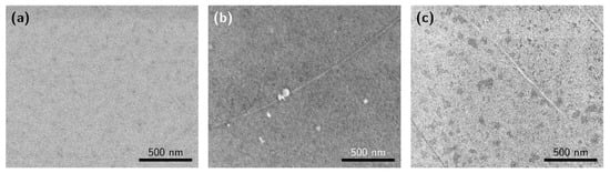 To compare the discussed method of PMMA removal, additional PMMA/graphene samples were prepared using the same wet transfer process (steps 1–3), but with PMMA removed with common solvents: acetone and chloroform. A total of five samples were prepared: three samples with DUV treatment and development in aqueous IPA (samples DUV1–DUV3), and one sample each for PMMA removal for 18 h at 23 °C with acetone and chloroform, respectively. As a reference, the standard commercially transferred graphene film to SiO2/p-Si substrate was also studied. To evaluate the effectiveness of our cleaning procedure, the surfaces of the graphene released with the DUV method and via traditional solvents (chloroform and acetone) were studied via SEM and AFM. SEM images of graphene films prepared by different PMMA removal methods are shown in Figure 5. Comparing the SEM images in Figure 5a–c, graphene processed using chloroform exhibited the highest number of PMMA residuals on the surface. The DUV (Figure 5a) and acetone (Figure 5c) processes showed lower numbers of residuals on the surface.