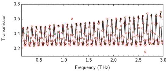 Any future applications of CVD graphene require contactless methods of graphene film electrical properties that can conduct large-area mapping and function rapidly []. One of such methods is the THz-TDS system, which has been adapted for such applications [,,,]. The THz transmission spectra were analyzed considering graphene on the dielectric substrate as the delta-thin conductive layer, which is described by the Drude conductivity model, with fitting parameters of sheet conductivity , scattering time , and substrate thickness [,,]. The transmission spectrum of the graphene sample is shown in Figure 8 by red circles and a fitted curve (black line), which coincide well with experimental points. There are several points (ejections) near the frequencies of 1.1 THz and 2.6 THz, which were caused by natural water vapor variation in ambient air. The transmission spectra of HR silicon were also measured before graphene transfer, demonstrating less dispersion behavior over the frequency range of interest. All measured time-domain characteristics were averaged 500 times.