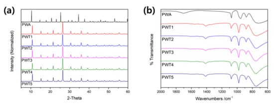 (a) X-ray diffraction and (b) FT-IR spectra of the PWTx samples.