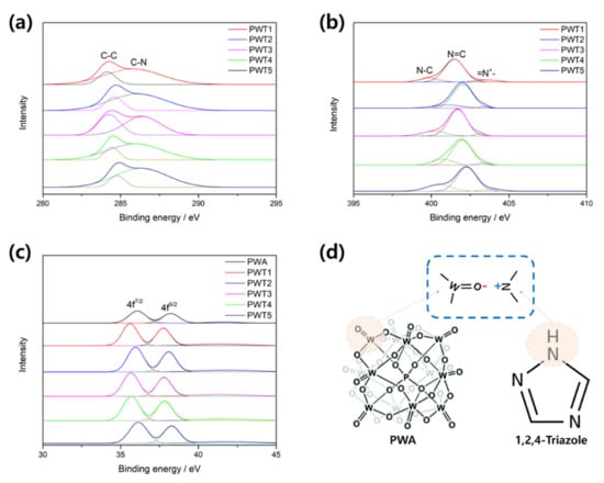 Contrarily, the binding energies of W 4f in Figure 3c were shifted to lower values in the triazole-PWA composites; this could be due to interactions between the Keggin PWA and carbon framework, enhancing the catalyst stability []. FT-IR and XPS analyses indicated that the triazole and PWA-synthesized composites maintained a PWA-specific structure. Furthermore, the terminal oxygen of the PWA electrostatically reacted with the non-bonding nitrogen of triazole, as shown in Figure 3d.