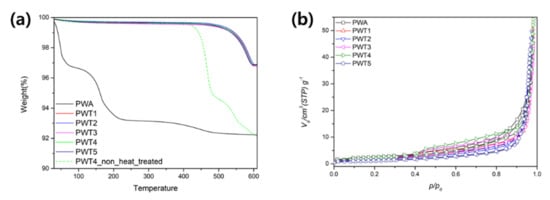 A thermogravimetric analysis (TGA) of the PWA and the triazole-PWA composites was used to analyze their thermal stability. As shown in Figure 4a, the TGA profile of the pristine PWA showed three steps of weight change. A weight loss was observed at ~9 wt%; it occurred by a two-step process below 250 °C and could be attributed to the water of crystallization. Additionally, a gradual weight loss in the temperature range of 300–500 °C could be attributed to the elimination of constitutional water []. Compared to the pure PWA, the TGA curves of triazole-modified PWA exhibited two main weight losses at approximately 450 and 600 °C. Thus, the triazole functionalization of the PWA particles significantly improved their thermostability, despite low boiling point of triazole (260 °C).