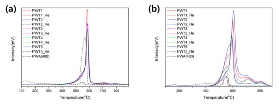 The temperature-programmed desorption of PWTx using (a) NH3 and (b) CO2.