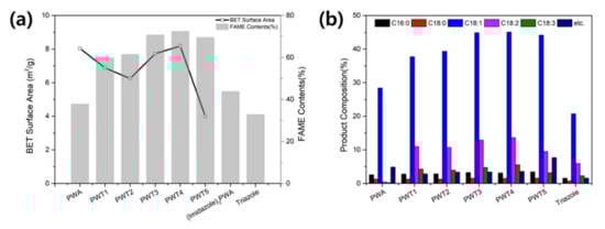As shown in Figure 6a, the transesterification of rapeseed oil was analyzed with a fixed methanol/rapeseed oil molar ratio of 10: 1 and 4 wt% of the catalyst (based on rapeseed oil) at 200 °C for 2 h. PWTx exhibited better catalytic performance than the pristine PWA and triazole, which showed only 37.79% and 32.88% conversion, respectively. Furthermore, on reacting the same heterocycles with imidazole, the yield (43.78%) was approximately 20% lower than that obtained using the triazole composite (61.5%). Thus, the enhanced catalytic performance of PWTx could be attributed to bifunctional catalysis by its basic and acidic sites (provided by triazole and the PWA, respectively) [,]. Additionally, the triazole-PWA composites exhibited different catalytic activities according to their composition; as the triazole content increased, the reactivity increased, along with the combination of relatively high surface area and appropriate bifunctionality with strong basic sites. However, although PWT5 had the smallest particle size and the proper bifunctional composition, it exhibited a low catalytic activity due to its low surface area from the distortion of the pore structure by incorporating excess triazole into the PWA.