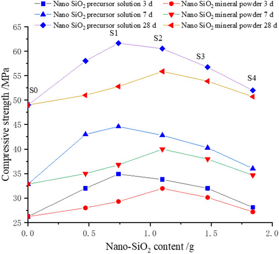 For the convenience of comparative analysis, cement mortar specimens with nano-SiO2 powder were prepared. The dosage of nano-SiO2 powder was consistent with the nano-SiO2 solid contents in the precursor solution, which were 0.11 g, 0.74 g, and 0.82 g, respectively.