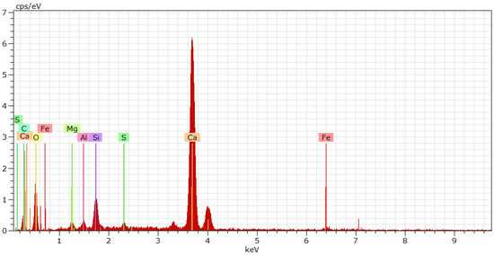 An energy spectrum analysis diagram of cement paste in a small area under 10,000× magnification is shown in Figure 4. The cement particles mainly contained Ca, Si, Al, and Fe, while the precursor solution mainly contained Si and O. When the cement particles just have contact with the NSPS, the surfaces of the cement particles partially dissolve, and the calcium ions in the cement particles dissolve in the water, forming a strongly alkaline solution. In an alkaline environment, not only does the active Si-O bond on the surface of cement particles break, which causes silicon to enter the solution and combine with water, but it also promotes the precipitation of H2SiO3 in the NSPS [19].