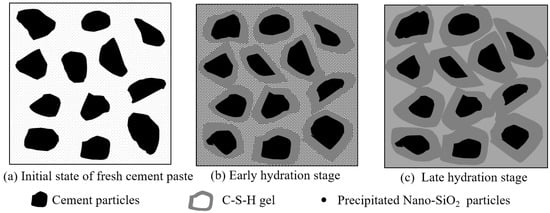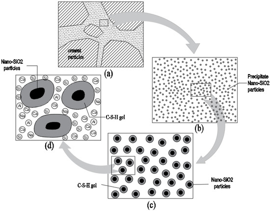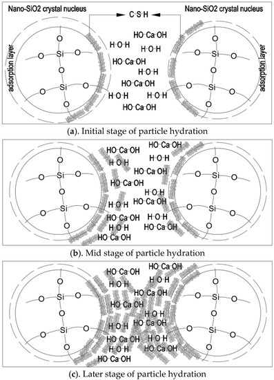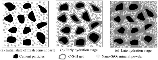 Nano-SiO2 particles mainly serve as activators and reactants in cement-based materials (Figure 9). In Figure 9a, the precursor solution facilitated the hydration process of cement as an activator after it was added to cement-based materials. When the nano-SiO2 particles precipitated as reactants, they could react with dissolved calcium and water in cement hydration products to produce C-S-H due to their own adsorption. The produced C-S-H adhered to nano-SiO2 particles. Nano-SiO2 provided new nucleation sites for C-S-H gel as active fillers. It can be seen in Figure 9c that, as the reaction continued, more and more C-S-H gels formed around the particles. The nano-SiO2 particles mutually bonded to form new spatial network structures, which filled in the pores among cement particles. This decreased the number of pores, increased the cohesive strength, and improved the compactness of the base material.