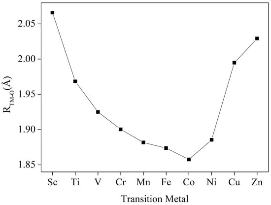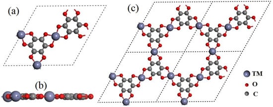 The structure of the MOF material constructed by TM-THQ is shown in Figure 1. Here, (a) and (b) are, respectively, the top and side views of a single cell, and (c) is a top view of a 2 × 2 supercell. The specific lattice constant values of these ten MOF materials after optimization are presented in Table S1. The top view of the monocell clearly shows that each monocell contains 12 C atoms, 12 O atoms, and 3 transition metal atoms, and that each metal atom is coordinated to 4 O atoms in the tetrahydroxybenzoquinone. Each atom of the 10 transition metals (from Sc to Zn) we considered resides in the same plane (Figure 1). The bond lengths between metal atoms and their nearest O atoms are in the range of 1.858 to 2.066 Å (Figure 2). The bond length of Sc-O is 2.066 Å, which is consistent with the fact that Sc has the largest atomic radius among the 10 metals. Furthermore, in order to study the electronic state of the monolayer, we performed a Hirshfeld charge analysis, and it can be seen from Table 1 that all the metal atoms in the 10 metals of the first transition metal series considered have a partial positive charge, while the nearest O atom has an opposite negative charge, which indicates that the metal atoms transfer some of their electrons to the THQ monolayer, making the metal atoms and O atoms interact with each other as ionic bonds in addition to ligand bonds. The analysis of the spin states of the metal atoms shows that Cr exhibits a spin state with a magnetic moment of 2.977 , while the rest of the metal atoms are in the non-spin state.