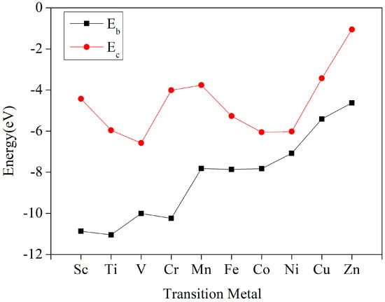It is obvious from Figure 3 that the cohesion energy of the metal bulk is below the binding energy of the corresponding metal TM-HTQ monolayer, which indicates that the metal atoms tend to bind to the tetrahydroxyquinone monolayer more than the metal atom agglomeration, thus making the metal atoms uniformly mosaic into the cavities of the tetrahydroxyquinone monolayer, and thus, the TM-HTQ monolayer has good stability. Meanwhile, the binding energy between these 10 transition metals (from Sc to Zn) and the tetrahydroxybenzoquinone monolayer shows a gradual increasing trend and weakening bond solidity. This is because the oxygen atom is a strong non-metallic atom, while Sc to Zn are of the same period, and the metallicity gradually decreases. Generally speaking, the stronger the metallicity, the stronger the bonding with the surrounding oxygen atoms, and conversely, the weaker the metallicity, the weaker the bonding with the oxygen atoms, thus showing a gradual increase in the bonding energy. The reason for the irregular fluctuations of the cohesion energy of the ten metals is that the ten transition metals belong to different crystal systems, among which Sc, Ti, Co, and Zn belong to a hexagonal structure; V, Cr, Fe, Ni, and Cu belong to a cubic crystal system structure, and Mn belongs to a trigonal crystal system structure. Different crystal systems have different atomic arrangements, which affect different ground state energies and thus exhibit irregular fluctuations.