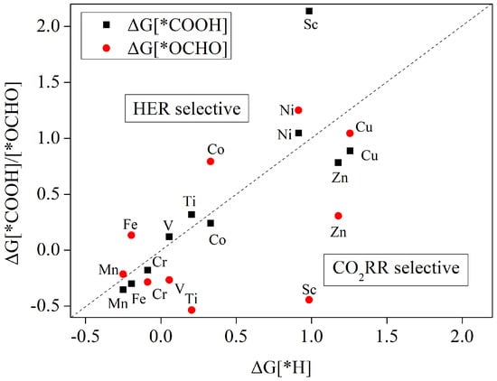 In addition, from Figure 4, it can be seen that the Gibbs free energy formed of *OCHO intermediates is higher than that for the formation of *H for the metals Mn, Fe, and Co, but the Gibbs free energy for the generation of *COOH intermediates is lower than that for the generation of *H. For the metals V, Ti, and Sc, the formation energy for the obtained of *COOH intermediates is also higher than that for the obtained of *H, but the production of *OCHO intermediates with Gibbs free energy is lower than at the time for the production of *H. Once the active site of the metal is occupied by O*CHO or C*OOH, there is no excess active site to accept H*. Therefore, it can be concluded that the six catalysts Mn, Fe, Co, V, Ti, and Sc are also catalytically active for the CORR reaction.