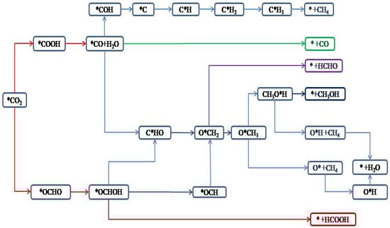Owing to TM-THQ electrocatalytic CO reduction is a single-atom catalytic procedure, it is widely assumed that it is difficult to produce poly-carbon products because the monoatomic catalytic process cannot achieve C–C coupling between intermediates. Therefore, theoretically, the single-atom catalytic CO reduction process is predicted as long as the C productos is considered. The most common C products in the electrocatalytic reduction of carbon dioxide are CO, CH, HCOOH, CHOH, and HCHO. Figure 4 shows the scheme of electrocatalytic reduction of CO to obtain C products [43].