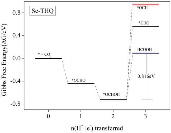 According to the scheme in Figure 5, the first-step protonation of CO after the adsorption of Sc-THQ occurs in the presence of external electricity potential to form *COOH or *OCHO intermediates. However, according to Figure 4, it can be seen that the Sc-HQ catalyst requires crossing a relatively high energy bar for the formation of *COOH intermediates in the first step of protonation, and the competitive reaction with HER shows weakness; thus, we only consider the generation of an *OCHO intermediate step in the electrocatalytic CO reduction process.