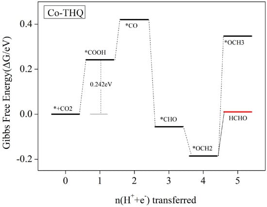Gibbs free energy profile of CORR at zero potential along the most favorable route of Co-THQ. In the aseous stage, the free energy of a CO molecule with a clean catalytic surface is zero.