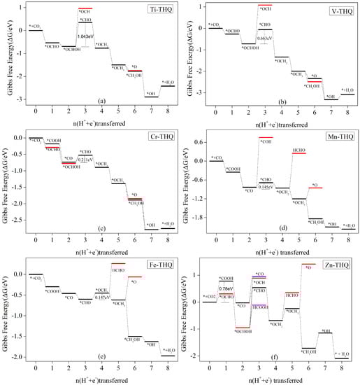 Gibbs free energy curves for (a) Ti-THQ, (b) V-THQ, (c) Cr-THQ, (d) Mn-THQ, (e) Fe-THQ, and (f) Zn-THQ, at zero potential, along the most favorable path of the CORR. The free energy zero point was set as the carbon dioxide molecule in the gaseous phase with a squeaky clean surface for the catalyst.