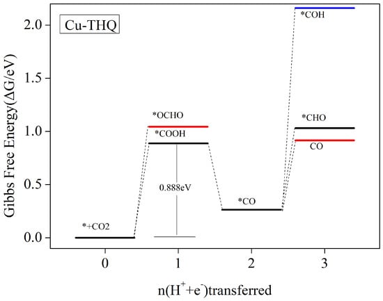 Figure 9 shows the Cu-THQ free energy steps for each step of the protonated carbon dioxide reduction. The reaction equations and the corresponding Gibbs free energy variations for each protonation step are shown in Table S12. After carbon dioxide is attracted to the Cu-HQ surface, the protonation reduction reaction proceeds in the presence of an external voltage. It can be seen in Figure 9 that the first step of protonation to form *COOH requires overcoming a lower energy barrier, and therefore, the formation of *COOH intermediates dominates. The second step of protonation to form *CO is a free energy reduction process. After *CO formation, the formation of *CHO/*COH by possible further protonation requires overcoming an energetic barrier of 0.767 eV/1.897 eV (Table S12), whereas the step where CO desorption occurs to obtain the product only requires the overcoming of an energetic barrier of 0.65 eV (Table S12). Therefore, the reaction *CO + H2O → * + CO + H2O dominates to obtain the product of CO and terminate the reaction. The reaction path of the whole process is * + CO2 → *COOH → *CO → CO. The step that determines the rate is * + CO2 + H+ + e−) → *COOH, which corresponds to a potential limit of −0.888 V.
