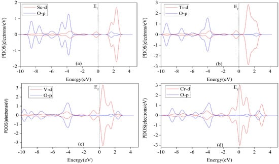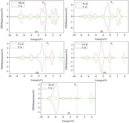 Organometallic catalysts with metal–ligand bonding theory suggest that the interaction between catalyst and intermediate is mainly - and -bonds. Figure 10 shows a clear overlap between the 3D orbits of metallic atoms and the 2p orbits of O or C atoms in the determining step intermediates (*OCHOH,*CO,*CHO or *COOH), either spinning up or spinning down, which indicates a good interaction between the TM-HQ monolayer and the intermediate. All these TM-THQs have non-zero electronic density of states at the Fermi energy level and exhibit metallicity, with the most obvious metallicity of Cr and Mn. However, the overlap effect of the 3D and 2P orbitals in Figure 10a–c is better than that of the 3D and 2P orbitals in Figure 10e–g). This indicates a stronger interaction of Sc, Ti and V with the respective intermediates than that of Cr, Mn and Fe. The stronger the interaction, the more stable the adsorption intermediate system is and the higher the energy barrier that needs to be overcome to ensure the catalytic reaction, which leads to a larger increase in the free energy of the decisive step of the Ti-THQ-catalyzed CO reduction, resulting in a more negative limiting potential for the reduction reaction. As can be seen in Table 3, the limiting potentials for the Sc-THQ, Ti-THQ, and V-THQ electrocatalytic CO reduction are 0.816 eV, 1.043 eV, and 0.633 eV, respectively, which are higher than those of the Cr, Mn, and Fe catalysts. This is very consistent with the results of PDOS. In addition, the limiting potential of Co is 0.242 V, which is lower than that of Cu and Zn. The overlap effect of 3D orbitals and 2P orbitals in Figure 10g is better than that in Figure 10h,i, which indicates that Co has stronger interaction with *COOH than Cu and Zn and exhibits a more stable structure. Thus, the energy barrier to be crossed for the formation of *COOH by the first step of protonation after CO adsorption on the surface of Co-THQ is lower than that of Cu and Zn.