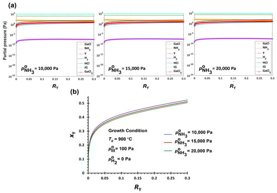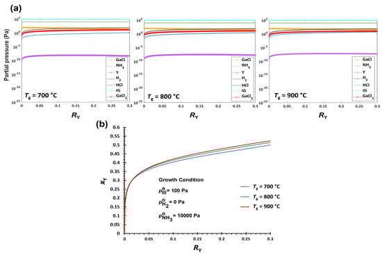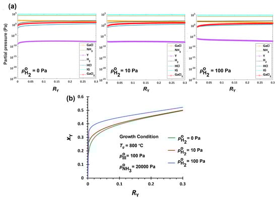 The effect of the input mixture of carrier gases is another factor to be considered. IG and H2 are used as carrier gases in conventional CVD processes, and their mixture ratio can affect the deposition of YGaN by participation of H2 in the chemical reactions. Especially, H2 is the by-product of possible reactions for the formation of YN and GaN (Equations (18)–(20)). Figure 2a shows the changes in equilibrium partial pressures of , , , , , , and as a function of RY at the H2 input range of = 0–100 Pa. The other conditions are fixed at growth temperature Tg = 800 °C, NH3 input partial pressure = 20,000 Pa, and = = 100 Pa. Hence, the V/III ratio is /() = 200. When comparing and at varied , both and increase with higher , while decreases. Variation of is marginal compared to the change of and . The effect of higher on the driving force of GaN formation is more than that of lower , resulting in lower GaN formation. The increments in with higher are significantly higher than those of , especially at lower RY, which causes higher YN formation, specifically at a lower RY. The xY vs. RY changes non-linearly with increasing , which shows that even at very low RY, a minimum xY ~0.1 can be obtained.