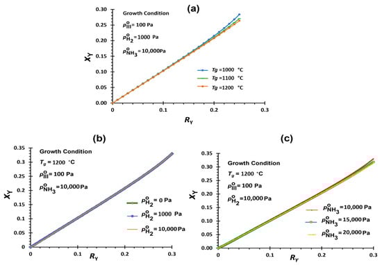 The V/III ratio is another critical growth parameter in the CVD method. Figure 3a shows the equilibrium partial pressure changes vs. RY at different V/III ratios in the range of 100–200 by changing = 10,000–20,000 Pa. The other conditions are fixed at Tg = 900 °C, = 0.000001 Pa, = 0 Pa, and = 100 Pa. By increasing the V/III ratio, and increase and decreases. The change in is marginal as compared to the change in . The driving force of GaN formation increases in the whole range of RY, mainly because of reduction. Although the increase in with higher V/III ratio could reduce the GaN formation driving force, its effect on the xY is limited as compared to the decrease in . Therefore, the composition of alloy becomes GaN-rich with the increasing V/III input ratio, as shown in Figure 3b. The change of xY in the whole range of RY shows the same trend at different V/III ratios. Also, the V/III ratio effect on the composition of YGaN alloy is less significant than the effects of hydrogen in the carrier gas.