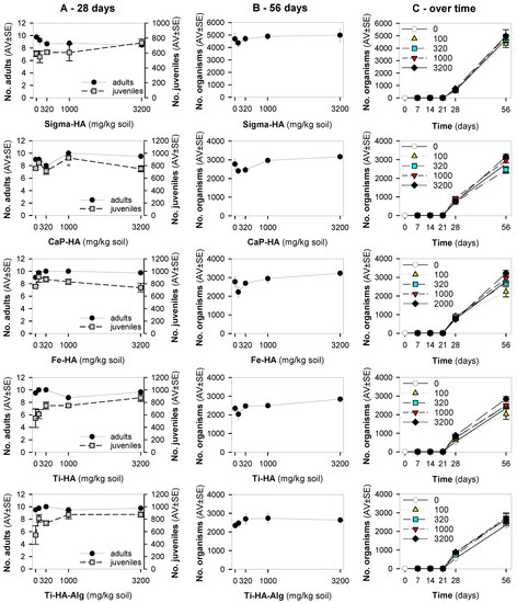 The results in terms of survival and reproduction from the Enchytraeid Reproduction Test, when exposing Enchytraeus crypticus in LUFA 2.2 soil to the commercial hydroxyapatite (Sigma-HA), calcium hydroxyapatite (CaP-HA), superparamagnetic iron doped hydroxyapatite (Fe-HA), and titanium-doped hydroxyapatite nanoparticles (Ti-HA), alginate/titanium-doped hydroxyapatite hybrid particles (Ti-HA-Alg) during (A) 28 days (OECD Standard), (B) 56 days (OECD standard extension), and (C) overview of the time series sampling at days: 7, 14, 21, 28 and 56 days. Values represent number of adults, juveniles, and population as average ± standard error (AV ± SE). *: p < 0.05 (Dunnett’s method).