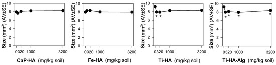 The results in terms of adults’ size from the Enchytraeid Reproduction Test, when exposing Enchytraeus crypticus in LUFA 2.2 soil to calcium hydroxyapatite (CaP-HA), superparamagnetic iron doped hydroxyapatite (Fe-HA), and titanium-doped hydroxyapatite nanoparticles (Ti-HA), and alginate/titanium-doped hydroxyapatite hybrid composite (Ti-HA-Alg), for 28 days. Values represent adults’ size (area, mm2) as average ± standard error (AV ± SE). *: p < 0.05 (Dunnett’s method).