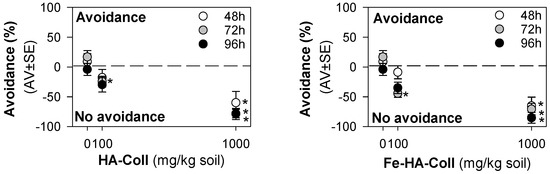 For the avoidance test, the validity criteria were fulfilled, i.e., less than 20% mortality and homogeneous distribution (no avoidance) in controls. The results showed that enchytraeids did not avoid the soil containing HA-Coll or Fe-HA-Coll, instead there was a dose-dependent preference for the spiked soil (Figure 3). The same pattern was observed at all exposure periods (48, 72, 96 h).