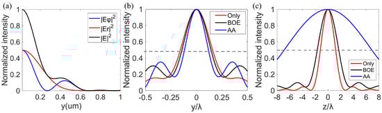 Theoretical calculation of the focal field of the azimuthally polarized vortex beam. (a) Refers to the radial normalized intensity distribution in the focal plane modulated only by the metalens. |Eφ|2, |Er|2, and |E|2 represent normalized intensities of the azimuthal, radial, and total components, respectively. (b,c) Represent the normalized intensity profiles along the y−axis and z−axis, respectively. The gray dotted line indicates the position of the half maximum intensity. Only indicates the case of only the metalens. BOE and AA indicate the case of the phase of BOE and annular aperture working with the metalens, respectively.