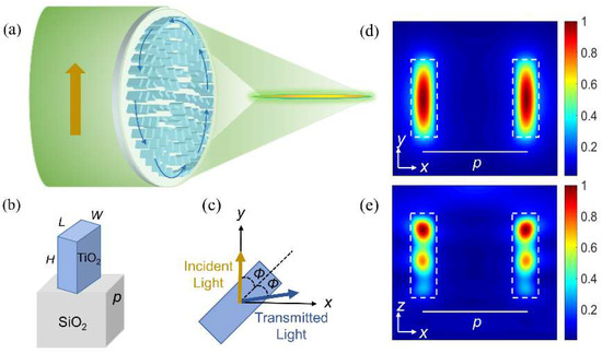 The schematic diagram of the generator of the needle beam is shown in Figure 2a. The PB metalens can convert the incident LPB (y−polarized) to APB, accompanied by vortex form and light focusing. The building blocks of the metalens are composed of TiO2 nanobricks and SiO2 substrates, as shown in Figure 2b. Dielectrics were chosen due to their high transmission efficiency compared to metals. The refractive indices of TiO2 and SiO2 were 2.46 and 1.46 at 532 nm, respectively. In order to prove the capability of local field manipulation by unit cells, we utilized the finite difference time domain (FDTD) method to calculate the magnetic energy density of nanobricks, as shown in Figure 2d,e. Because of the high refractive index contrast between the nanobrick and its surroundings, light energy is concentrated in the nanobrick, so that each nanobrick can be considered as a waveguide truncated on both sides. Thus, this leads to differences in the phase shifts (Φx and Φy) and effective refractive indices [] of two waveguide modes polarized along L and W of each rectangle. Therefore, the LPB possesses a phase delay due to different velocities of polarization components along L or W of the nanobrick. Precisely because of this phase delay between the electric field components, the polarization of the transmitted beam changes. As a result, unit cells can work as local wave plates with an optical axis.