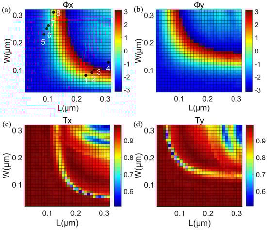 (a,b) For x− and y− polarized light incidences, phase shifts Φx and Φy are used as the function of the L and W of nanobricks, respectively. (c,d) The transmittance Tx and Ty are the function of the L and W of nanobricks for the incident x− and y− polarized light, respectively. The L and W of unit cells from 1 to 4 were L = 230, 250, 260, and 310 nm, and W = 85, 95, 100, and 130 nm. The unit cells from 5 to 8 were arranged by rotating the nanobricks from 1 to 4 at every angle of 90° clockwise.