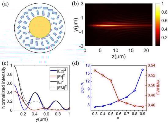 According to the theoretical results in Figure 1b,c, the annular aperture can help to extend DOF and form a sharper focus. Then, an annular aperture is introduced to work with metalens to generate the needle beam. As can be seen from Figure 6a, the metalens had an inner opaque gold plate to form the annular aperture σ. The total electric field distribution at the axial cross−section is shown in Figure 6b. Obviously, the DOF of the focal spot obtained by this method was significantly longer than that in Figure 4b, which is consistent with the theoretical calculation results in Figure 1c. In combination with Figure 6b,c, the needle beam with a FWHM of 0.46 λ and DOF of 16.4 λ was obtained under σ = 0.9. In this method, the phase, polarization, and amplitude are controlled simultaneously to achieve an optical needle with subdiffraction size and long DOF. Interested readers may refer to the supplementary document to further study the results and discussion on the polarization evolution of the generated optical needle.
