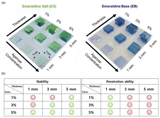 (a) Real images of ES state and EB state PNHC according to thickness and agarose concentration. The hydrogel images in the right panel were taken after 15 min treatment with a PBS solution (pH 10). (b) PNHC optimization table considering stability and penetration ability (1 mm of thickness and 5% of agarose concentration were optimized).