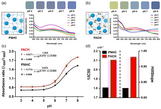 Next, we measured the color change efficiency of PHNC and FACH according to the pH and compared the absorbance ratio (λ600/λ900) (Figure 4c and Supplementary Information Figure S1). The absorbance ratio for both PNHC and FACH showed a sigmoidal conformation for pH levels from 3 to 8 and was fitted to the sigmoidal model below.