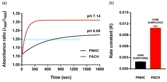 (a) Change of absorbance ratio (λ600/λ900) over time after treatment with PBS (pH 8) in PNHC (black) and FACH (red). (b) Comparison of rate constants (K = τ−1) between PNHC and FACH.
