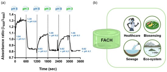 (a) Reversible test of FACH through recording absorbance ratio (λ600/λ900) under consecutive pH changing conditions with 10 min-intervals. (b) Applicable fields of FACH.