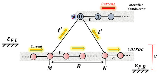 The renormalized nearest-neighbor hopping of the 1DLSOC is , where , , and being the Rashba and Dresselhaus SOC intensities, respectively. The parameter t is the nearest-neighbor hopping in the 1DLSOC and in the metallic conductor, which, for simplicity, has been taken to be equal, and a is the lattice parameter. The spin, represented by the quantum number , is quantized along an axis pointing in the direction , where is the polar angle and [53]. The operator creates (annihilates) an electron with momentum k and spin in the 1DLSOC. The second term describes the side-attached metallic conductor and the third corresponds to the connection between both subsystems. The operator creates (annihilates) an electron at site i of the metallic conductor. The matrix elements connecting the two subsystems, when the Hamiltonian describing the 1DLSOC is represented in the reciprocal space, carry a k-dependent phase, which is given by , where R is the distance between the sites N and M of the SOC chain where the connections are established, as shown in Figure 1, and is supposed to be site-independent.