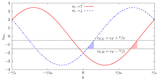 where and are the undressed equilibrium Green functions at the first site of the semi-chain and at the k momentum state of the 1DLSOC, respectively. The summation that appears in the denominator of Equation (6) is over all k’s belonging to the first Brillouin zone. This is why the Green function is spin-independent. However, the summation in k of Equation (5) is restricted to the momentum of the electrons participating in the current, satisfying . This condition originates a spin-dependent current result from Equation (5).