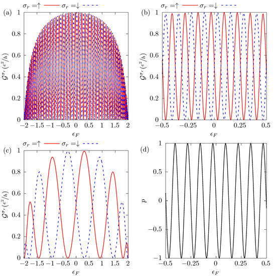 It is important to emphasize that Equations (10) and (12) are compatible if Equation (13) is satisfied, indicating that the maximum polarized current is obtained when it is completely spin-polarized. The conditions expressed in Equations (12) and (13) determine the Fermi level required to obtain a complete spin polarization of the current. In other words, this double condition maximizes the difference between the conductances, thus meaning that for one spin the conductance is zero and for the other it adopts the maximum possible value, a half quantum of conductance, . This is the case shown in Figure 3, where the conductance oscillates, as a function of the Fermi level , between zero and . We also observe in Figure 3a,c that the conductance peaks, around , are higher than those at the edges of the band due to the dependence of the conductance on the DOS of the metallic semi-chain (see Equation (8)). We present in Figure 3b a magnification, around the origin, of the same results as in Figure 3a, where the totally polarized conductance maximum value is half a quantum of conductance. In this configuration, the parameters of the system are taken to be , and we assume the Dresselhaus spin–orbit interaction . According to Equation (13), a completely spin-polarized current with conductance equal to is achieved when the Rashba SOC is , which can be obtained by controlling the external electric field responsible for the Rashba SOC, operating as a device tuner. Panel (c) shows the conductance for a small value of the distance between contacts, , and . In this configuration, the value of that satisfies the full spin polarization conditions is . The Rashba SOC manipulation ensures that when the conductance for one spin is zero, the conductance for the other could be very close to the maximum possible value, such that the device operates with a large and fully polarized current.