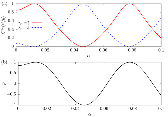 Figure 4 shows the conductance , panel (a), and the spin polarization p, panel (b), as a function of the Rashba SOC intensity , for the parameters , , and . The Fermi level is assumed to be and corresponds to the first positive value where the spin-down conductance is zero, as shown in Figure 3b. Analyzing the results, we see that by increasing the Rashba SOC intensity and keeping the other parameters fixed, and change their value until becomes close to and , when . This value satisfies the condition imposed by Equation (13), reproducing the maximum of and the minimum of as shown in Figure 3b. We notice that by increasing , the oscillates and other points of maximum polarization appear with conductance near , which corresponds to other solutions of Equation (13). In panel (b), when satisfies Equation (13), we observe that p alternatively takes the values of +1 or −1. This figure illustrates that, by changing the Rashba SOC intensity, it is also possible to tune the system so that for one spin the conductance is zero while for the other the results are very close to the maximum possible value.