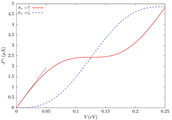The electronic current injected into the metallic conductor is obtained from the conductance by Equation (7). Its behavior, as a function of the applied potential V, is shown in Figure 5. The parameters that define the system are taken to be the same as those of Figure 4, for the SOC intensities discussed above, for which the conductance is completely spin-up. As in Figure 4, the Fermi level is fixed at the positive value where the first spin-down conductance minimum occurs, according to Equation (12), .