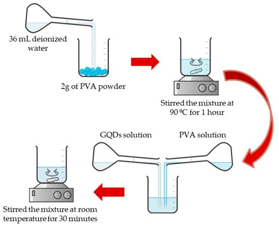 PVA with an average molecular weight of 146,000–186,000 (87–89% hydrolyzed) and a stock solution (100 mg/mL) of carbaryl (98.0%) were obtained from Sigma-Aldrich (St. Louis, MO, USA). GQDs synthesized using the hydrothermal method (1 mg/mL) were provided by ACS Material (Pasadena, CA, USA). The solution emitted blue light (460 nm) when excited with a 365 nm UV beam. The purity of GQDs was more than 80% with a particle size of less than 5 nm. For preparation of the PVA solution, 2.0 g of PVA powder was mixed with 36 mL of deionized water. Then, the solution was stirred for 1 h with a magnetic stirrer at 90 °C. To generate the GQDs-PVA solution, the previously prepared PVA solution was mixed with the GQDs solution in a 1:1 volume ratio and stirred at room temperature for 30 min. Figure 1 shows the schematic preparation of the composite solution. Then, various concentrations of carbaryl solutions were prepared by diluting the appropriate amount in deionized water, using the diluting formula M1V1 = M2V2.