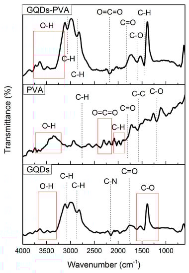FTIR spectra of GQDs, PVA, and GQDs-PVA.