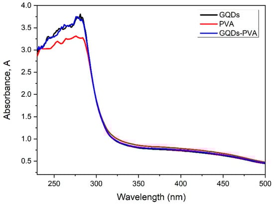 The optical properties of the composite materials were observed based on the UV-Vis spectrum with a spectral resolution of 0.1 nm. Thus, the absorption spectra of GQDs, PVA, and GQDs-PVA thin films were obtained at different wavelengths, ranging from 200 to 500 nm. As can be observed in Figure 9, the absorbance of GQDs showed the highest value of 3.8 at 281.7 nm. Meanwhile, the absorbance of PVA showed the lowest value of 3.3 at 275.4 nm. After GQDs were immobilized with the PVA layer, the absorbance value was approximately 3.7 at a wavelength of 276.3 nm. This peak may be attributed to the n–π* transition of the carbonyl group, as presented in the FTIR analysis [].