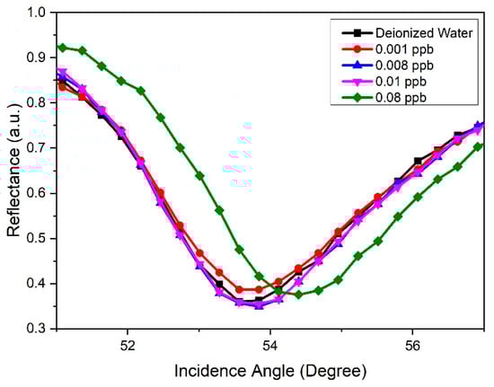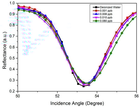 In the initial SPR analysis, the gold thin film was used as a baseline to compare the gold-modified GQDs-PVA layer. As a preliminary test, deionized water was injected into the cell and the incidence angle for the reflectance curve was recorded as a reference. Then, injections of carbaryl concentrations at 0.001, 0.008, 0.01, and 0.08 ppb were recorded. During the analysis, a sharp dip in the curve was obtained at a specific incidence angle that corresponded to the resonance angle, which resulted from the reflected light reduced because of the efficient transfer of energy to surface plasmons. As shown in Figure 13, the incidence angle for the reflectance curve of the gold thin film was recorded at 53.323°. As expected, the gold thin film had a weak binding capacity and was unable to distinguish changes in the refractive index of different concentrations of carbaryl, which led to approximately the same shift of the resonance angle.