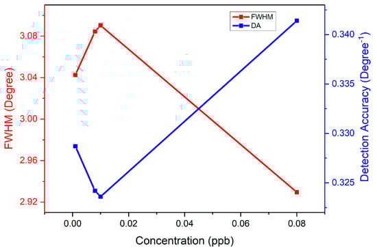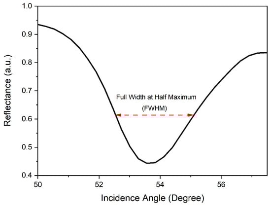 Full width at half maximum (FWHM) is a parameter that can indicate a sensor’s efficiency and accuracy []. The FWHM can be evaluated as the distance between the curve points at half the maximum peak level of the reflectance curve, as shown in Figure 15. Theoretically, a lower FWHM value indicates a shaper reflectance curve, which represents better sensor accuracy []. Through the FWHM data, detection accuracy (DA) can be obtained. DA is defined as the ratio of the shift of the resonance angle relative to the FWHM []. Therefore, DA is inversely proportional to the FWHM. In this analysis, the FWHM was experimentally measured from the reflectance curve for GQDs-PVA thin film after interaction with different concentrations of carbaryl.